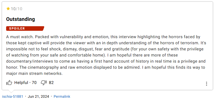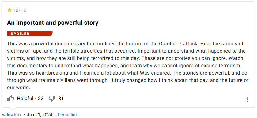 Since October 7th, 2023, “documentaries” made with the sole purpose of justifying the ongoing Gaza genocide have been listed on IMDb. These “documentaries” are then bombarded with bot-generated 10-star reviews, many of which use the same AI-generated language heralding these propaganda pieces as essential viewing. All of these reviews are part of Israel's propaganda—or as Israel calls it, “hasbara”—strategy, which has been in overdrive for the past year in an increasingly desperate effort to justify its ongoing genocide of Palestinians.