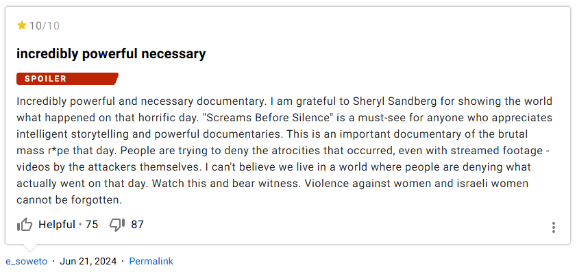 This flood of reviews tells IMDb’s algorithm—just like interactions on any other platform—to push the film to more users, increasing the film’s reach and adding more power to the hasbara campaign that spawned Screams Before Silence.